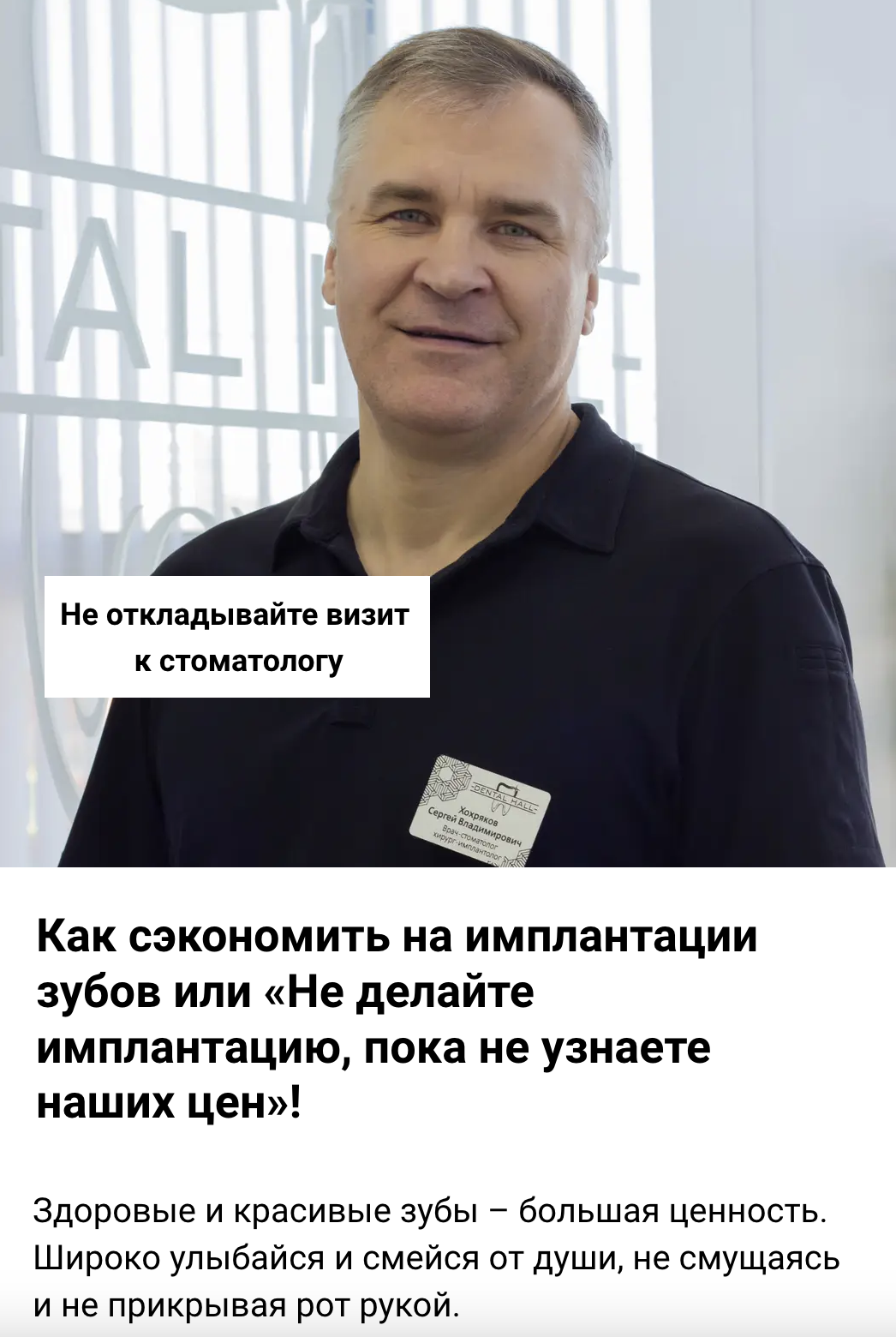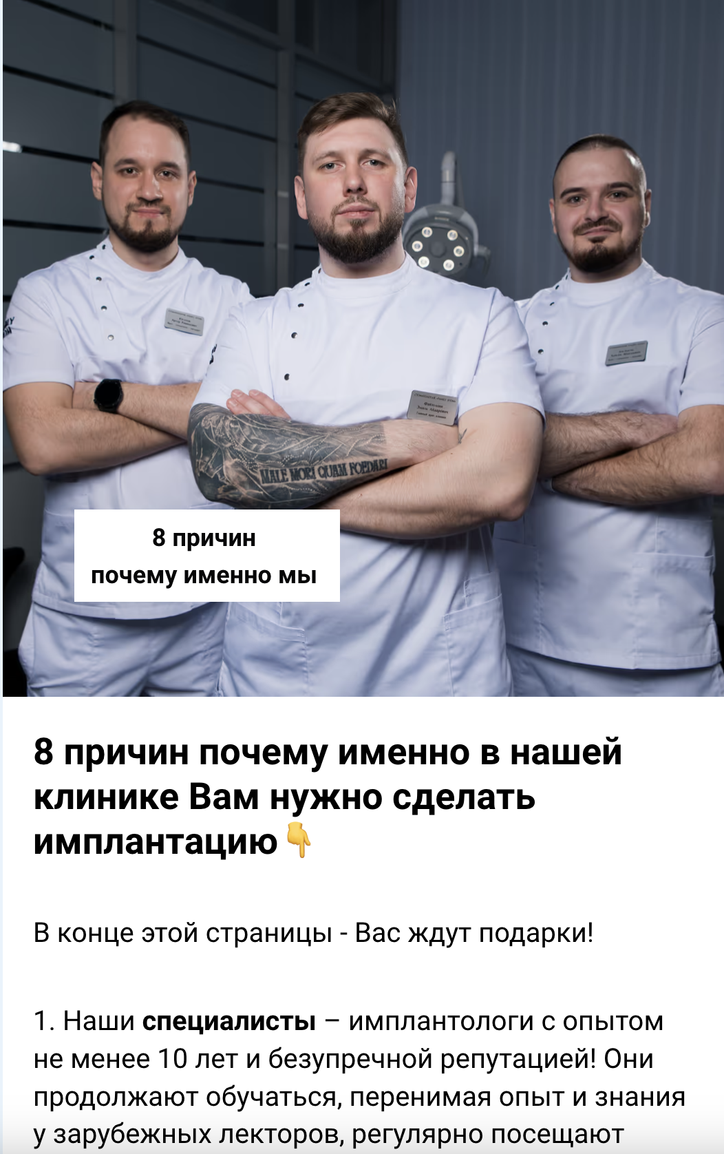 В отличие от стандартного подхода, который используют уже примерно ВСЕ стоматологии (посадочная страница с предложением "в лоб" и рекламой Яндекс Директ), наш метод показал и продолжает показывать в 2-3 разалучше окупаемость рекламы! Ниже примеры сайтов большинства стоматологических клиник.