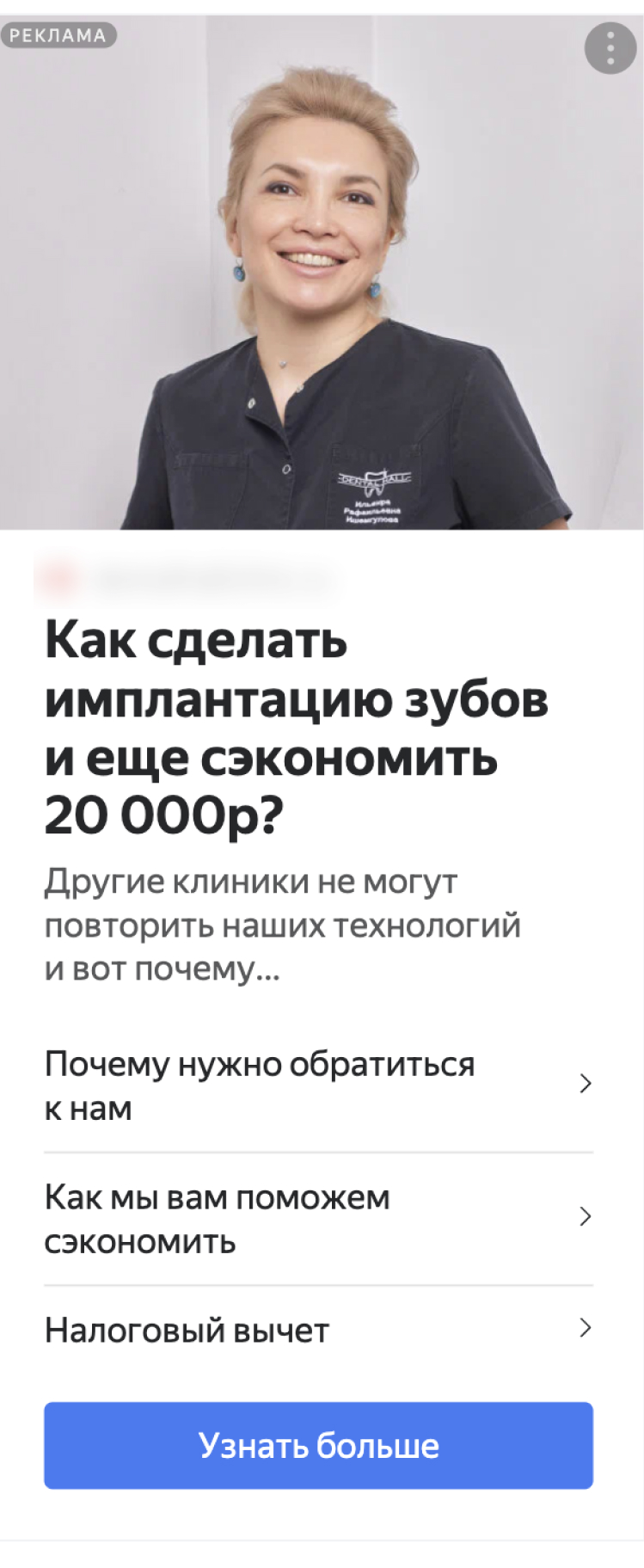 При формировании креативов мы использовали фото тех же сотрудников, что и на сайте. Такой подход не вызывает диссонанса у клиента, сайт воспринимается как логичное продолжение рекламных креативов.